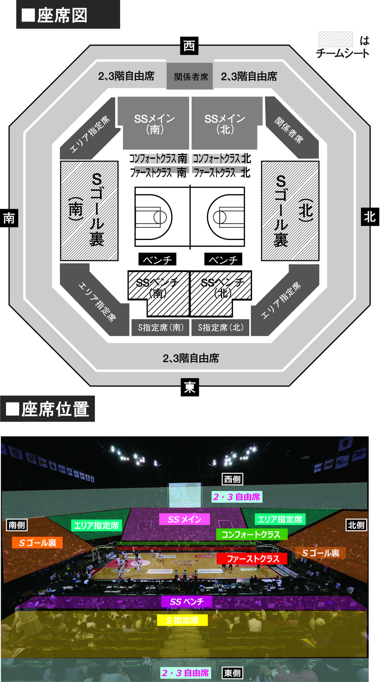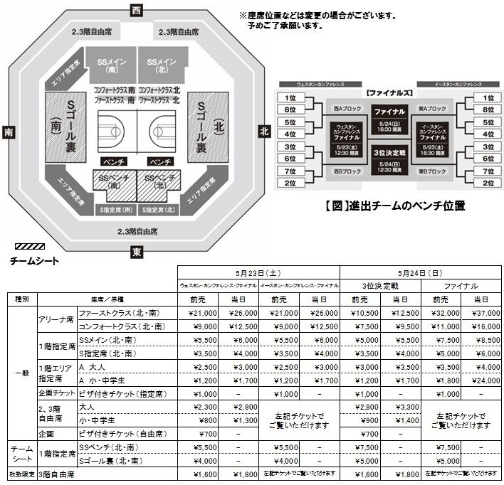 ※チームシート(座席表斜線部分)は、指定するチームの進出順位、カンファレンスファイナルでの勝敗に関係なく、指定するチームのベンチにより近い側 (ベンチ裏、ゴール裏)でご覧いただける席です。チームシートの発売開始は、4月11日(土)より先行抽選販売、5月12日(火)より一般発売を行う予定です。 詳細な先行予約及び発売スケジュールはbjリーグ公式HPでお知らせ致します。