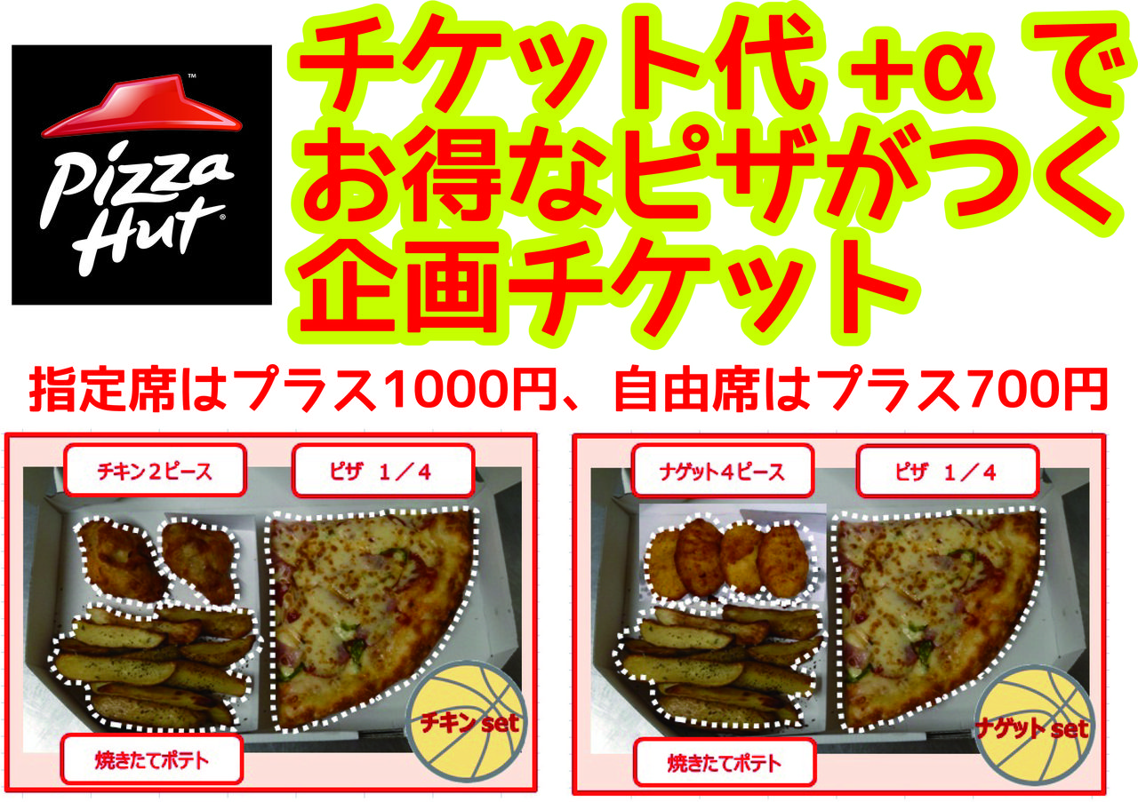 ※企画チケットは前売り価格のチケット代プラスの金額(指定席はプラス1000円、自由席はプラス700円)でボリューム満点なピザセットが付いたお得なチケットです。詳しくはbjリーグ公式サイトをご覧ください。