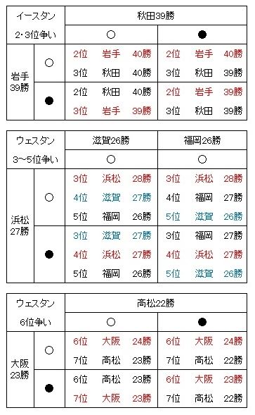 本日の試合結果により、岩手、秋田のプレイオフホーム開催(カンファレンス4位以内)、滋賀のプレイオフホーム開催(カンファレンス4位以内)が決定しました。